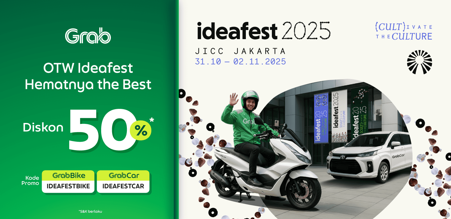 Biar gak pusing cari parkir di IdeaFest, naik Grab aja! Nikmatin diskon 50% pakai kode promo: