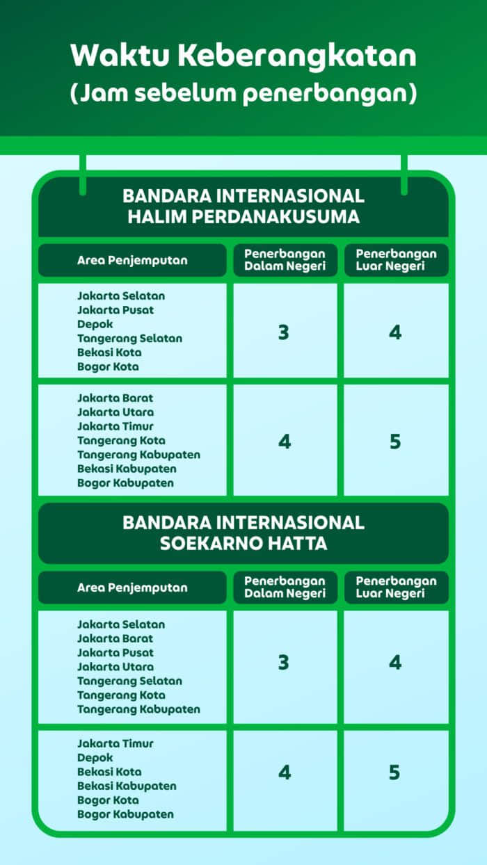 - Jaminan On-Time Kejar Pesawat berlaku untuk perjalanan dari Jakarta, Bogor, Depok, Tangerang, dan Bekasi untuk penjadwalan perjalanan ke Bandara Internasional Soekarno Hatta dan Bandara Halim Perdanakusuma.