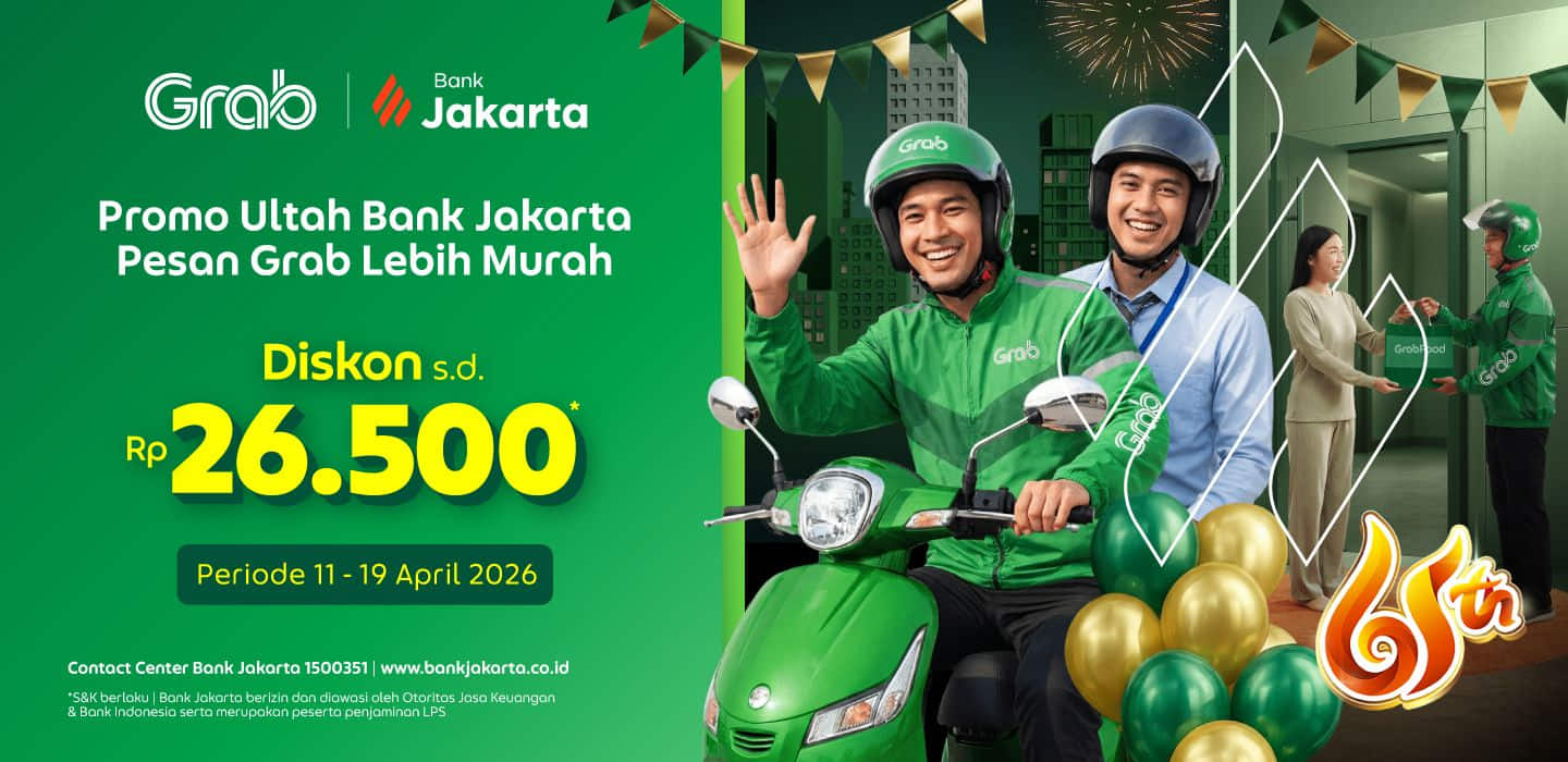 Nikmati Promo Spesial Ulang Tahun Bank Jakarta! Dapatkan diskon s.d. Rp26.500 untuk transaksi di Grab!