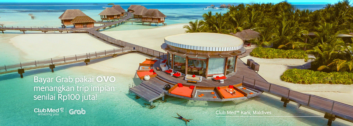 Untuk kamu yang belum pernah bayar Grab pakai OVO, mulai 3 Sep 2018, segera aktivasi OVO di aplikasi Grab-mu, top up saldonya, dan terus bayar Grab pakai OVO untuk menangkan hadiah utama 3 (tiga) trip impian ke Maldives – lengkap dengan makanan, beragam aktivitas seru, klub anak-anak, dan hiburan malamnya untuk 3 orang pemenang beserta pasangan!