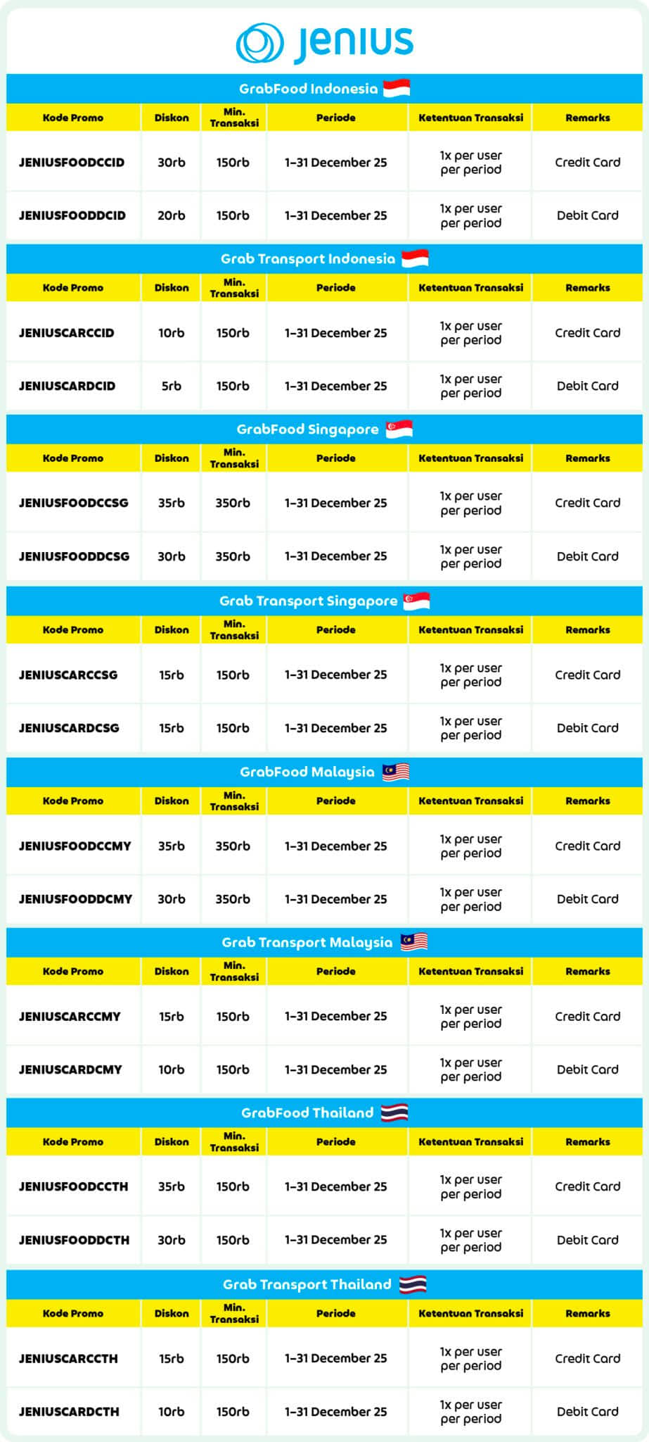 Untuk menikmati promonya, jangan lupa untuk tambahkan Kartu Debit/Kredit Jenius kamu sebagai metode pembayaran di Grab, ya! Cek di sini buat tambahkan Kartu Debit dan Kartu Kredit Jenius di Grab 👇