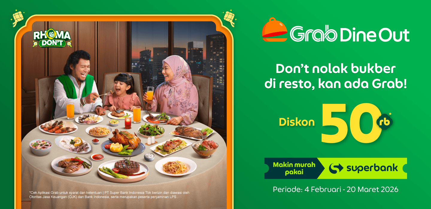 • Diskon GrabFood untuk pengguna baru Superbank, Diskon 75% s.d. Rp50rb dengan kode promo SBFOODN (min. transaksi Rp50rb)