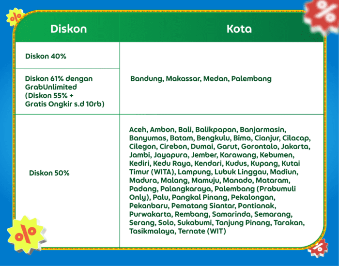 - Diskon s.d. 61% (55% min. belanja 69rb maksimal potongan 50rb + Diskon Ongkir s.d 10rb) spesial member GrabUnlimited berlaku di kota Jakarta dan Surabaya.
