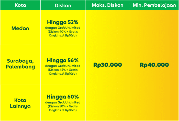 - Maksimal penggunaan diskon adalah sebanyak 20x per bulan dan hanya dapat digunakan 5x di masing-masing hari. Kuota bulanan (sejumlah 20x) tersebut akan diperbarui setiap bulan, selama Anda tetap menjadi member GrabUnlimited.