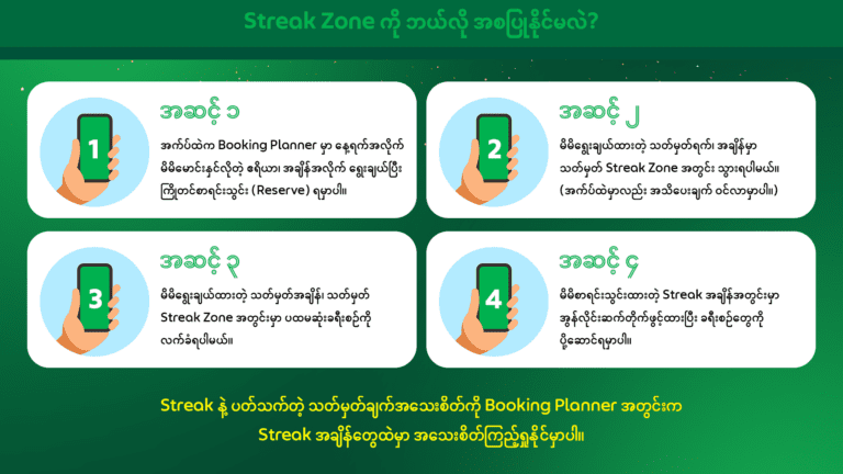 👉🏻အပိုဝင်ငွေ ဖန်တီးနိုင်မယ့် Streak Zone အတွက် အက်ပ်ထဲက Booking Planner မှာ နေ့ရက်အလိုက် မိမိ မောင်းနှင်လိုတဲ့ ဧရိယာ၊ အချိန်အလိုက် ရွေးချယ်ပြီး အပတ်စဉ် ကြိုတင် စာရင်းသွင်း Sign up လုပ် ရမှာပါ။
