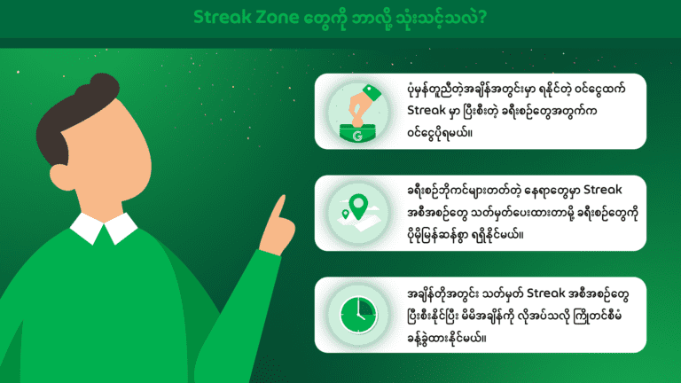 ❗ တစ်ရက်အတွင်းမှာ Streak Zone တွေကို တစ်ခုထက်ပိုပြီး ပြီးမြောက်အောင်လုပ်နိုင်တာမို့ သေချာတဲ့ အပိုဝင်ငွေဖန်တီးနိုင်ဖို့ မိမိ မောင်းနှင်နိုင်တဲ့ အချိန်အတိုင်း ကြိုတင်စာရင်းသွင်းပြီး လုပ်ဆောင်နိုင်ပါတယ်နော်။
