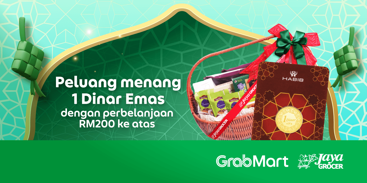 Dari 19 Februari hingga 12 Mac 2026, belanja RM200 dan ke atas dalam satu pesanan di Jaya Grocer melalui GrabMart untuk peluang memenangi Dinar Emas, RM50 Jaya Grocer Gift Card, atau Hamper Jaya Grocer!