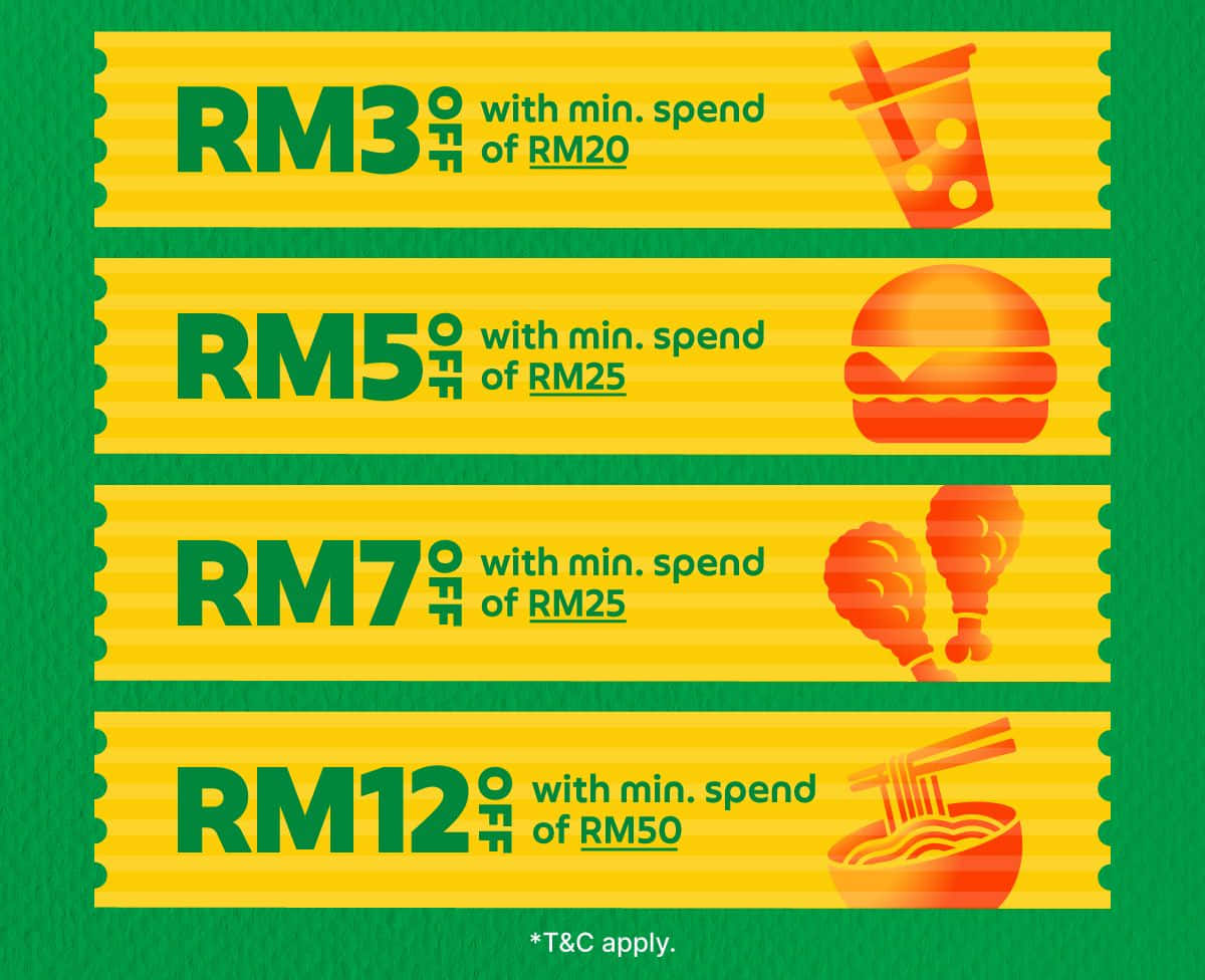 This promotion is valid at RM12 Off with a minimum spend of RM50 per order.