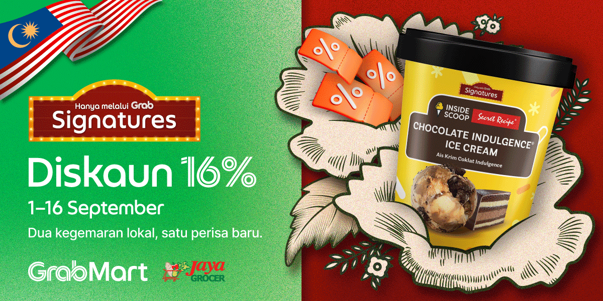 Sambut dengan aiskrim Inside Scoop x Secret Recipe, hanya di Grab Signatures. Dapatkan diskaun 16% apabila anda pesan dari Jaya Grocer. Tawaran terhad, jangan ketinggalan!