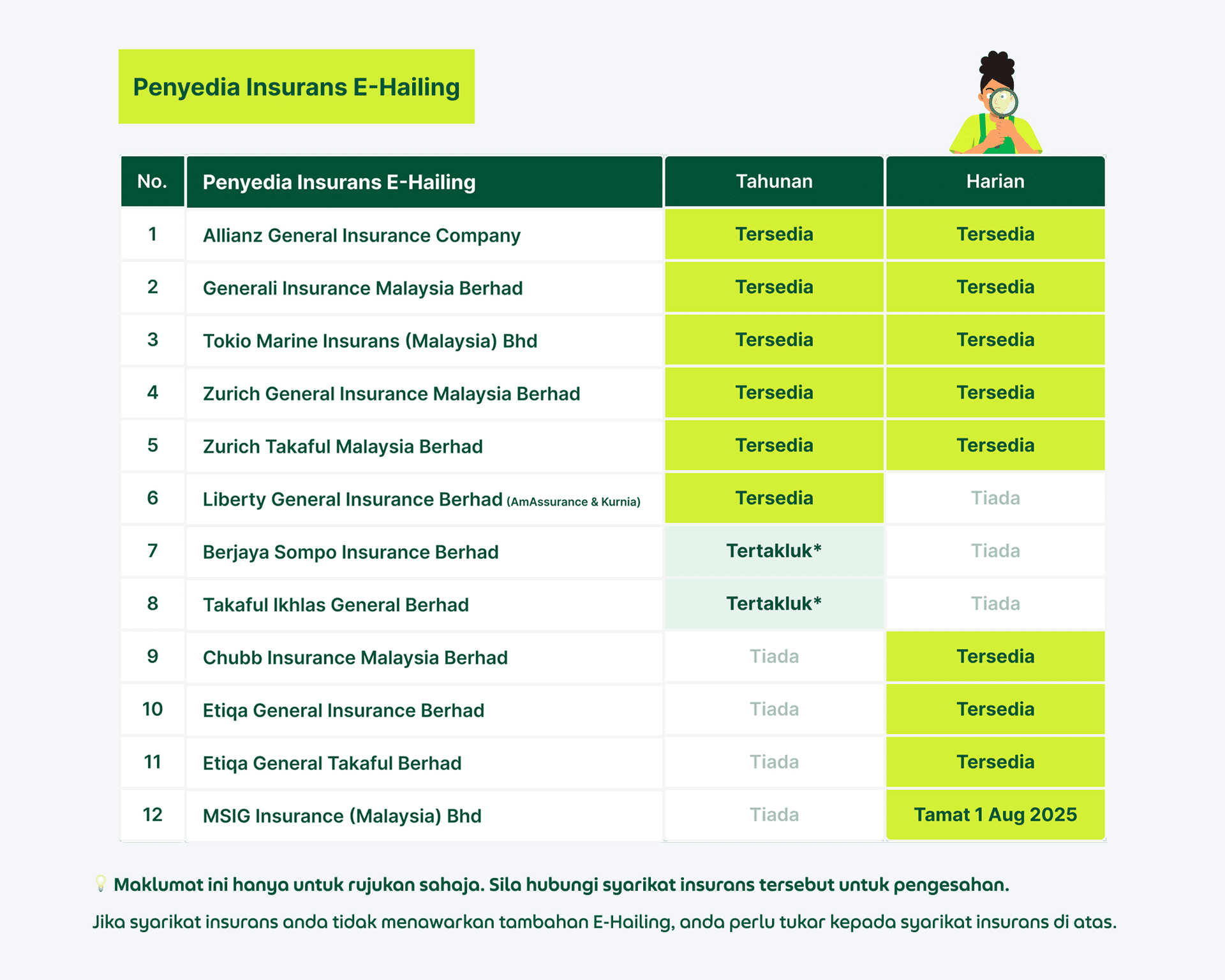 *Insurans E-Hailing merupakan keperluan lain yang dinyatakan oleh Kementerian Pengangkutan. Ini adalah berbeza daripada insurans kenderaan persendirian anda dan memberi liputan pekerjaan E-Hailing anda.