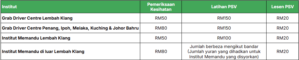 *Yuran yang dibayar semula untuk Latihan PSV yang dilengkapkan di Institut Memandu dalam:-