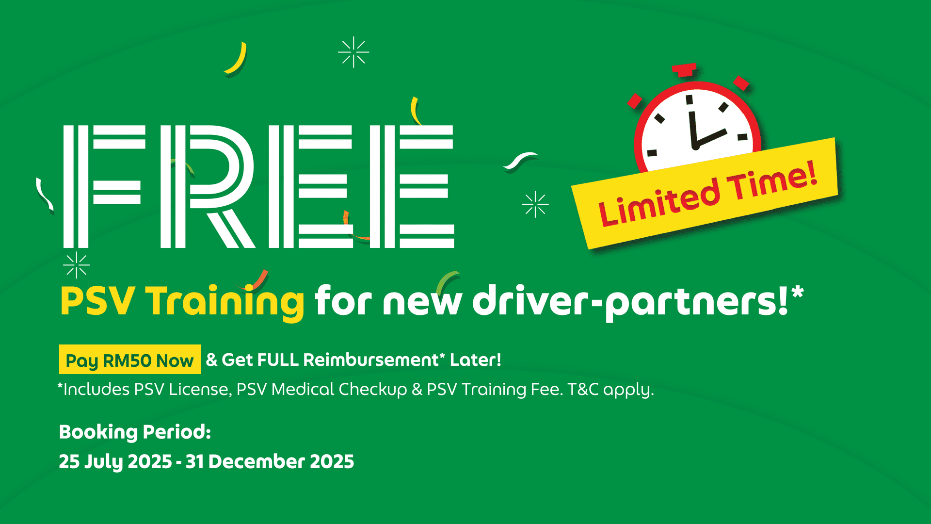 *Rakan-Pemandu GrabCar E-Hailing Anda akan menerima bayaran balik PSV sekali sahaja dalam tempoh 14 hari bekerja setelah melengkapkan 30 perjalanan (E-hailing) di bandar pendaftaran anda dalam masa 30 hari dari tarikh pengaktifan akaun. Sila layari laman web https://register.grab.com/my untuk pendaftaran baru.