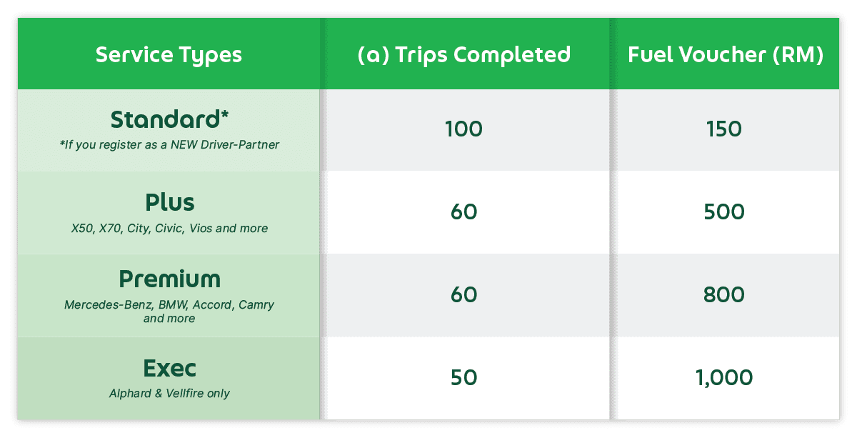 (a) Each Driver-Partner must complete the trips required for their respective service type to be eligible for the fuel vouchers. For example, the requirements are: