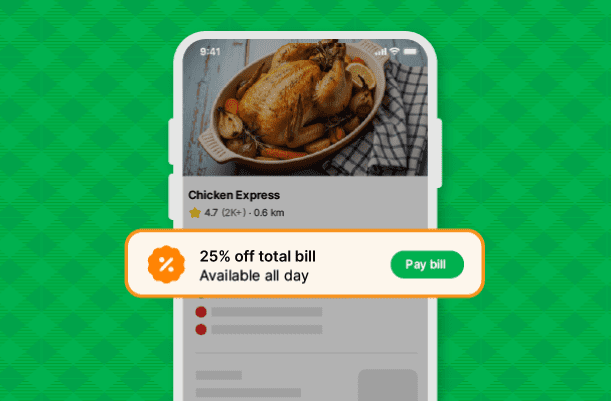 Save with discounts of up to 25% off your total bill at your first visit to any restaurant.