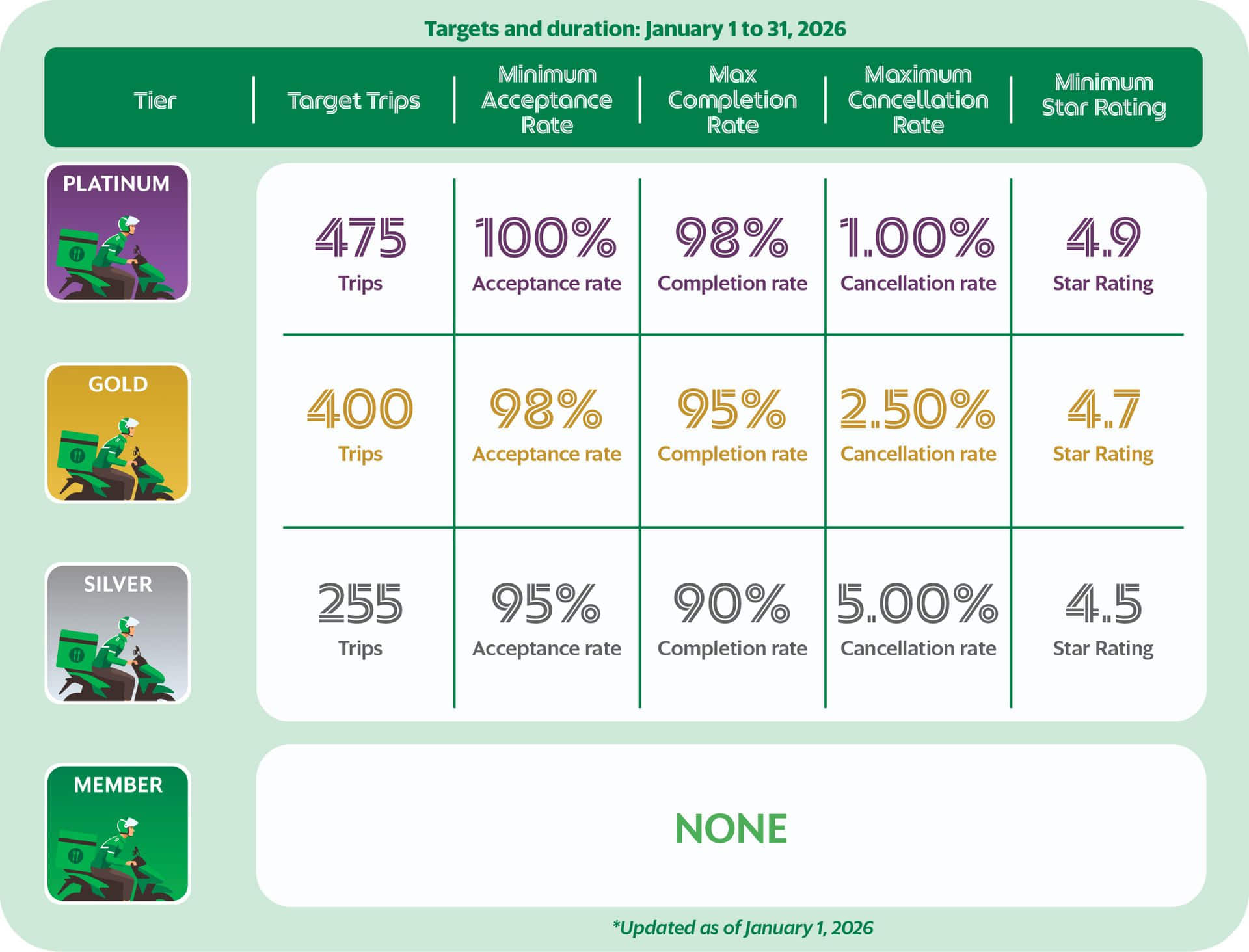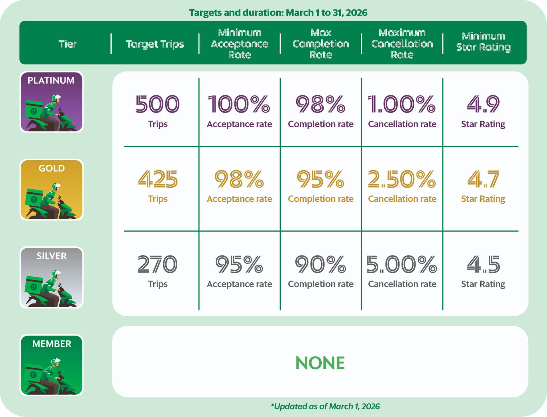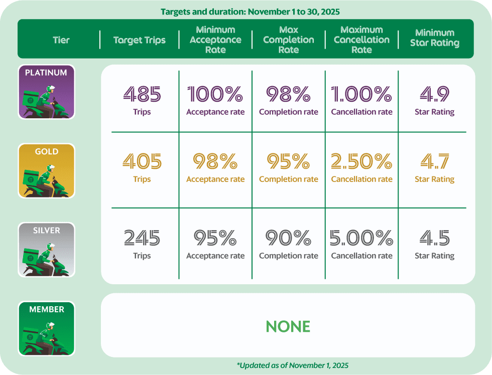 Lahat ng delivery-partners ay bibigyan ng pagkakataon maabot ang target rides at criteria kada buwan. Kapag hindi mo na na-hit ang iyong targets, may chance ka uli next month para maabot ito!