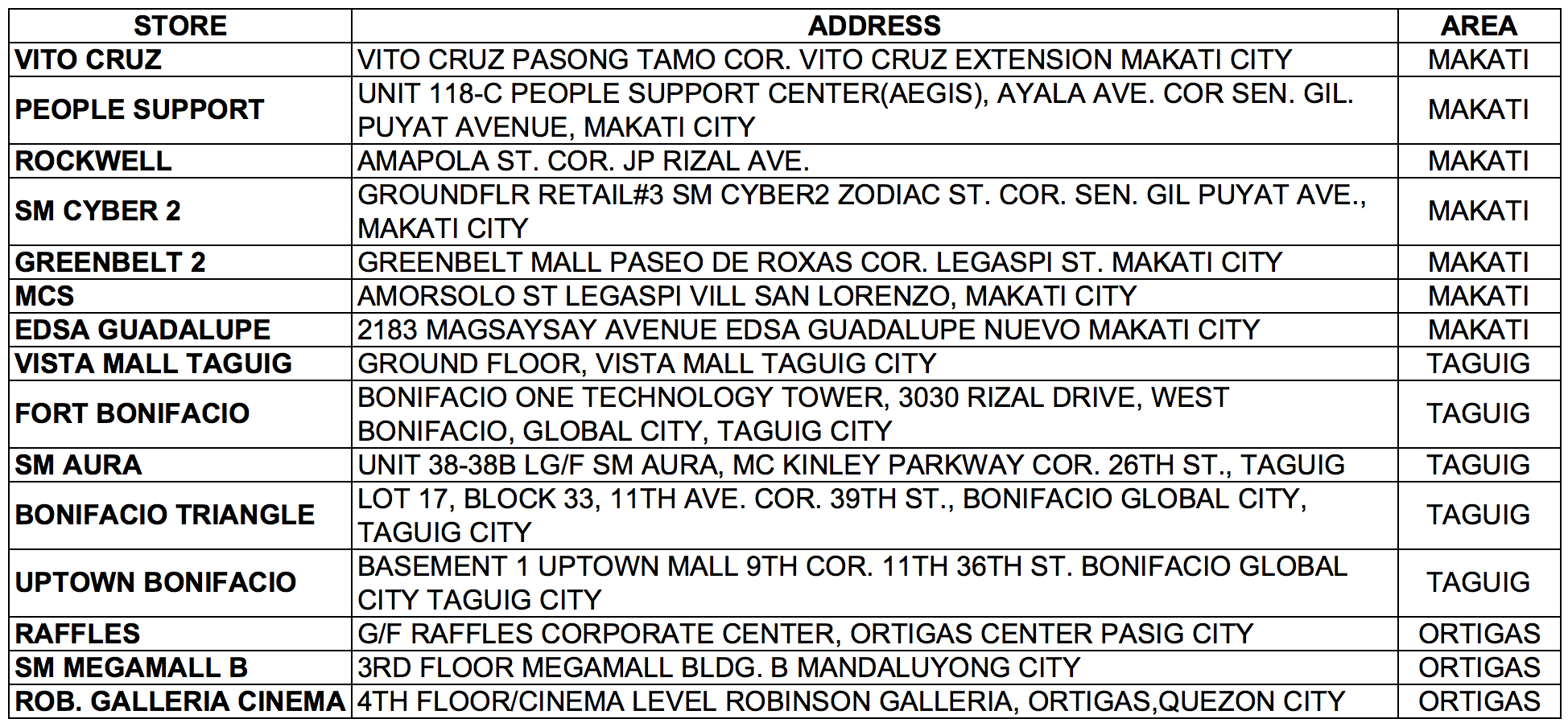 - Redemption of Four Cheese Chizza and Zinger is only valid to select KFC branches in Makati, Taguig and Ortigas (see complete list below)