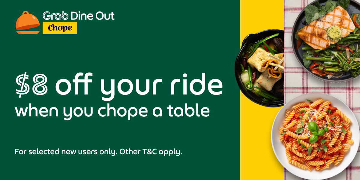 From now till 21 Dec 2025, just make and fulfill your first table reservation on Grab Dine Out, and get $8 off your next Grab ride*!