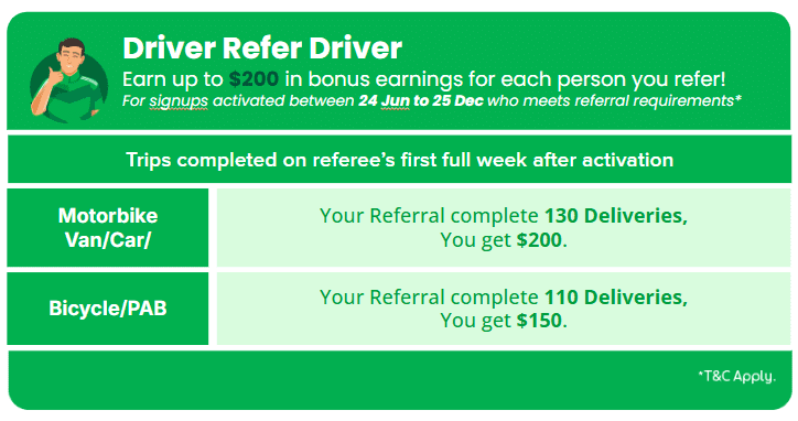 As long as you are an existing partner in Grab: Know someone who can help us? Refer a friend to us and enjoy unlimited incentive payout for each friend you successfully refer as a delivery partner, T&C apply. The good news is, there is no limit to the amount of referrals!