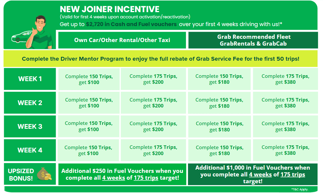 3. Any PHV drivers who are new to GrabCar, reactivating their accounts or switching from Grab’s delivery or hitch services is eligible for this New Joiner Incentive.