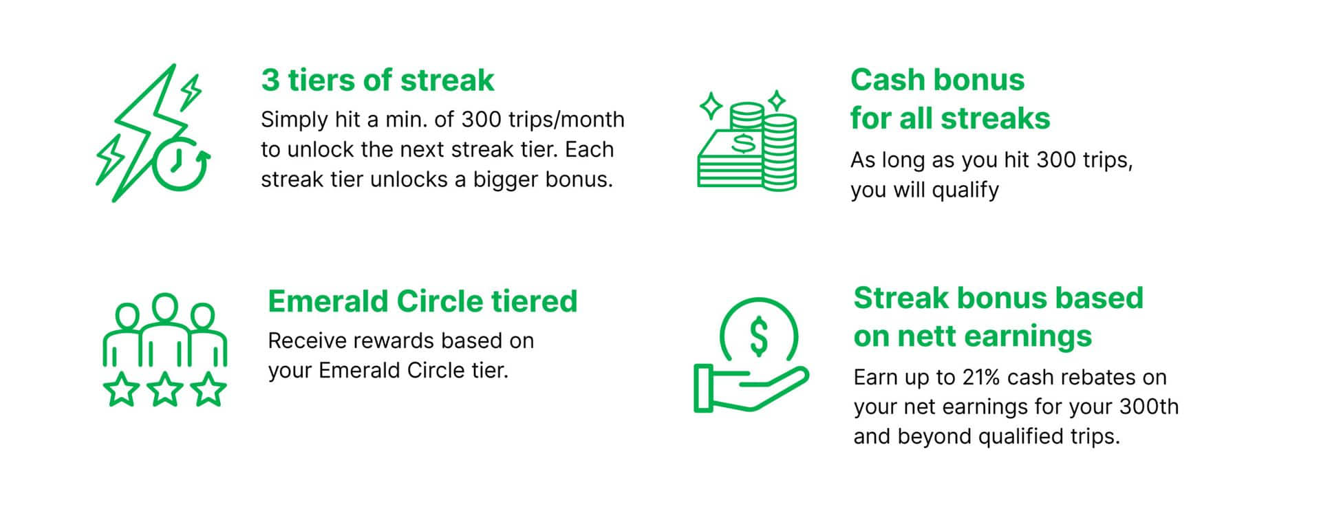 Drive regularly with Grab and complete at least 300 trips in a month. Get rewarded for your consistent driving with cash rebates on your net earnings.