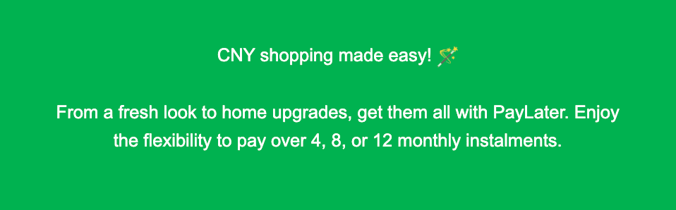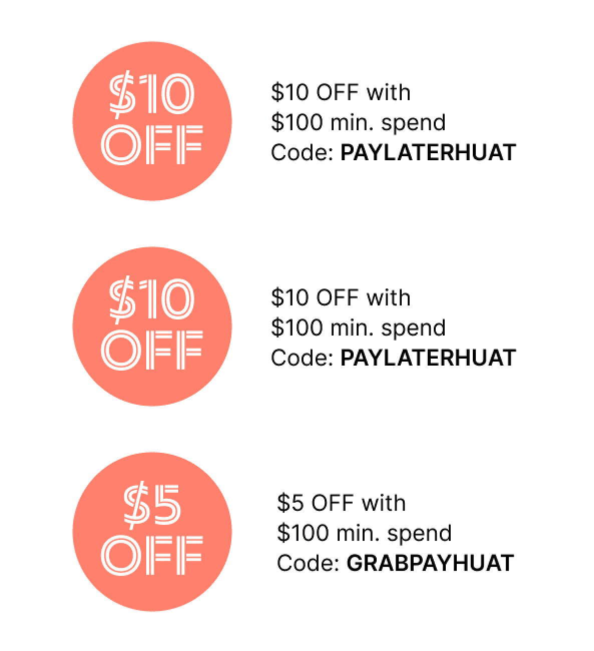 To qualify for the $10 OFF PayLater online and in-store promos, a minimum spend of $100 must be made with PayLater (‘Pay in instalments’ or ‘Pay next month’) only. It is not valid if payment is made with third-party e-wallets.