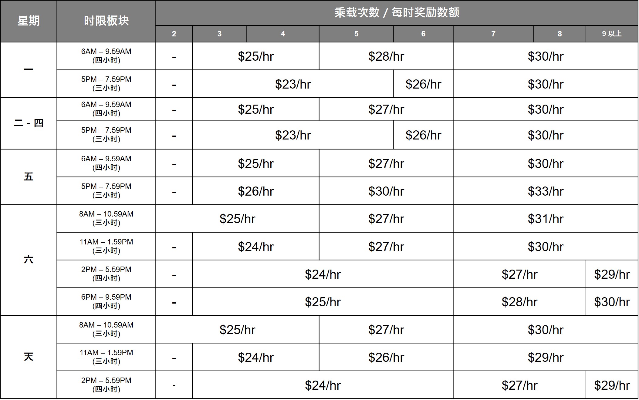 - 陈先生平时若从2pm至6pm在线完成7趟旅程,他的总收费可能达$60。但在全新《每时奖励》配套下,他的收入将增加至$108!