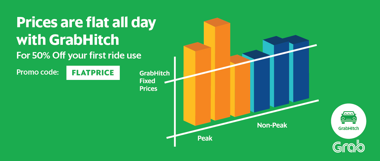 - GrabHitch prices are fixed by distance and unaffected by demand or peak hour timings.