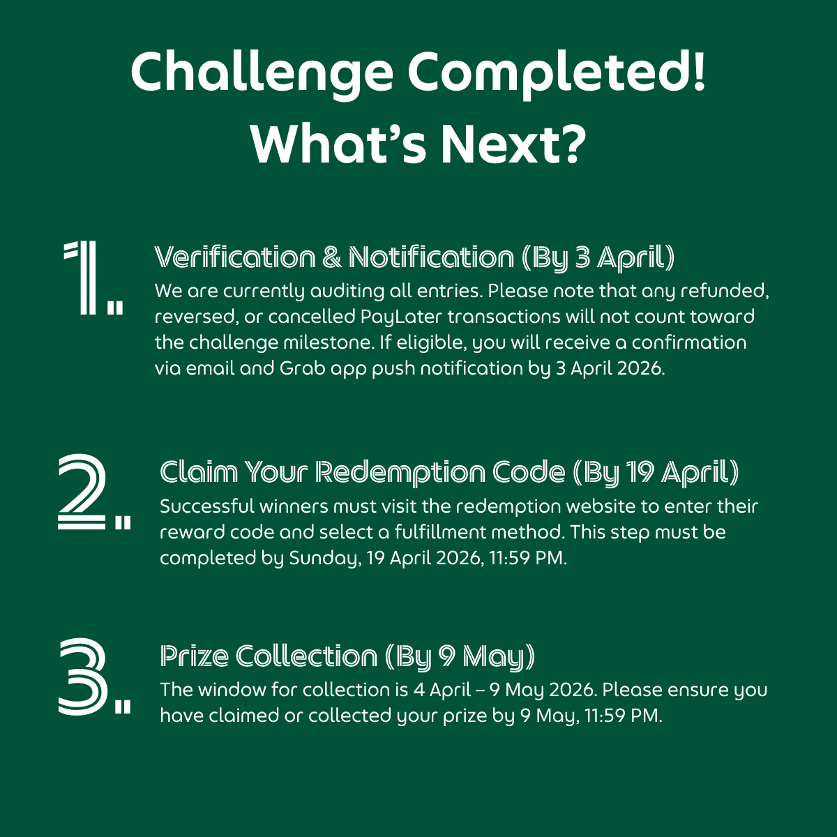 Any refunded, reversed, cancelled, or voided transactions made with PayLater by Grab will not be counted towards the Challenge milestone. Where a transaction is refunded after a milestone has been achieved, Grab reserves the right to revoke or adjust the reward accordingly.