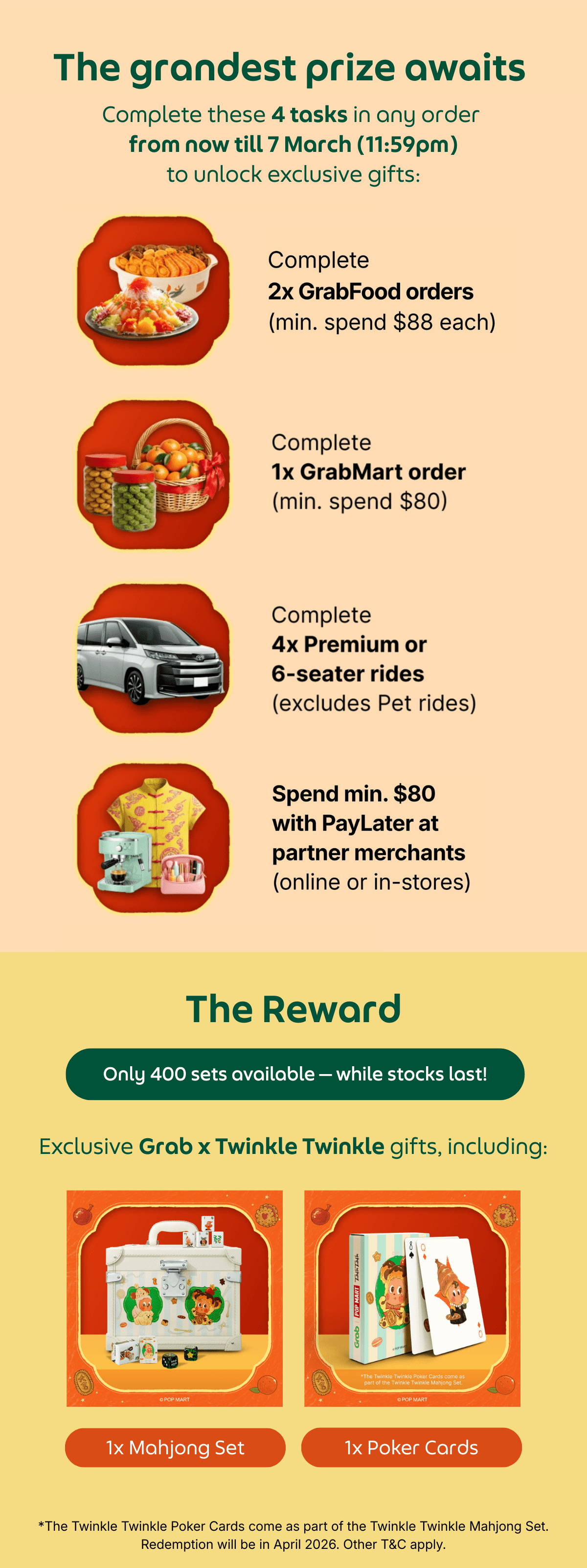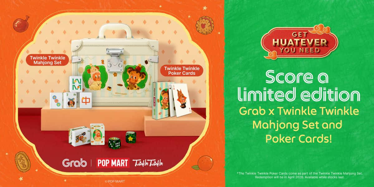 Only eligible orders transacted on GrabFood, GrabMart, as well as Premium ride bookings, Large Car (6 seater) ride bookings and Family 6 seater ride bookings from 30 January 2026 (10:00am) to 15 February 2026 (23:59) will count towards the Huatever Challenge, while redemptions last. Grab reserves the sole and absolute right to end the Challenge or any component thereof at any time, without giving prior notice or compensation in cash or in kind.
