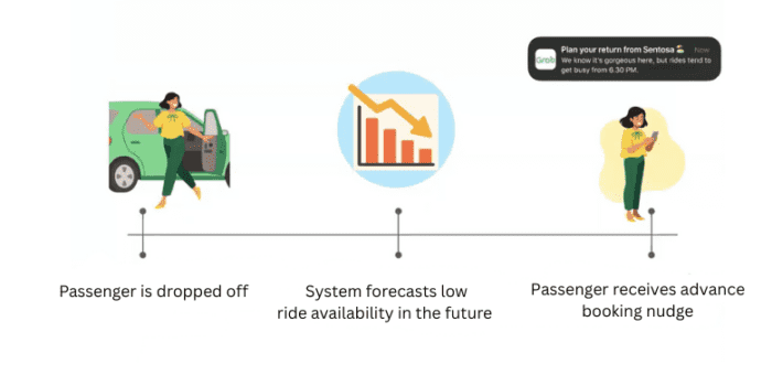 To do that, our data science team built something called the Fulfillment Rate Forecasting system. It quietly works in the background, predicting where passengers might have trouble getting a ride in the next few hours. And if the system spots a potential pinch point, for example, very few drivers near your drop-off location, it will send you a notification suggesting an advance booking. Think of it as a heads-up from Grab, so you’re not left waiting around.