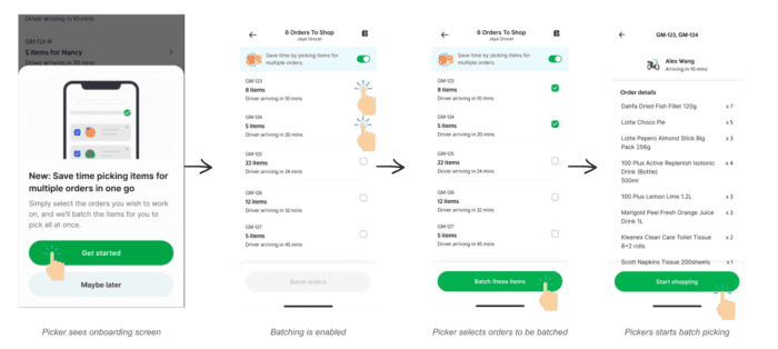 We also introduced a way for pickers to gather multiple orders at the same time. We gave the app an update that allows pickers to select which orders to batch together, while the system also suggests the optimal orders to combine for maximum efficiency.