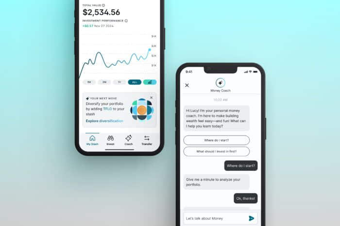Left: Stash app home screen. Right: AI Money Coach, the Stash app’s integrated AI-driven financial companion.