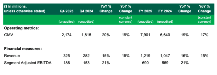 - Mobility GMV grew 20% YoY, or 19% YoY on a constant currency basis, to $2,174 million during the quarter. For the full year 2025, Mobility GMV grew 19% YoY, or 17% YoY on a constant currency basis, to $7,901 million. Mobility transactions grew 27% YoY in 2025, outpacing Mobility GMV growth as we drove greater adoption of our affordable services.