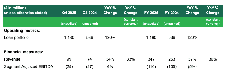 - Financial Services revenue grew 34% YoY, or 33% YoY on a constant currency basis, to $99 million in the fourth quarter of 2025. For the full year 2025, Financial services revenue grew by 37% YoY, or 36% YoY on a constant currency basis, to $347 million. The strong YoY growth was primarily driven by increasing contributions from our lending business.