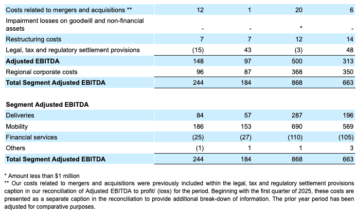 This document and the investor webcast include references to non-IFRS financial measures, which include: Adjusted EBITDA, Segment Adjusted EBITDA, Segment Adjusted EBITDA margin, Total Segment Adjusted EBITDA, Adjusted EBITDA margin, Adjusted Free Cash Flow, gross cash liquidity and net cash liquidity. Grab uses Adjusted EBITDA, Segment Adjusted EBITDA, Segment Adjusted EBITDA margin, Total Segment Adjusted EBITDA, and Adjusted EBITDA margin for financial and operational decision-making and as a means to evaluate period-to-period comparisons, and Grab’s management believes that these non-IFRS financial measures provide meaningful supplemental information regarding its performance by excluding certain items that may not be indicative of its recurring core business operating results. For example, Grab’s management uses Total Segment Adjusted EBITDA as a useful indicator of the economics of Grab’s business segments, as it does not include regional corporate costs. Adjusted Free Cash Flow excludes the effects of the movement in working capital for our lending and digital banking deposit activities. Grab uses Adjusted Free Cash Flow to monitor business performance and assess its cash flow activity other than its lending and digital banking deposit activities, and Grab’s management believes that the additional disclosure serves as a useful indicator for comparison with the cash flow reporting of certain of its peers. Grab uses gross cash liquidity and net cash liquidity to assess our ability to meet short-term obligations and invest in growth opportunities.