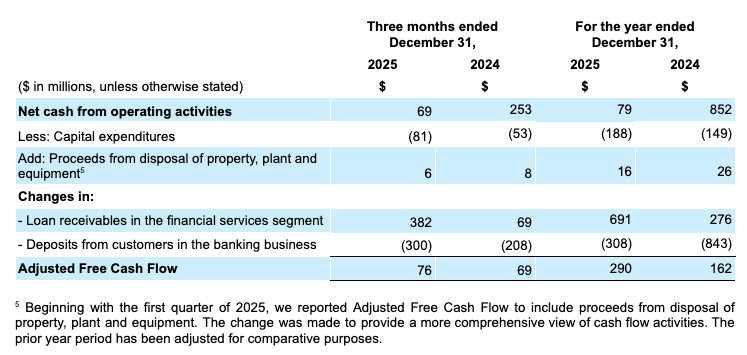 - Operating Cash Flow was $79 million in 2025, a reduction of $773 million YoY, with higher outflows for loan receivables in the lending business and a smaller increase in deposits from customers, partially offset by improvement in profit/(loss) before income tax.