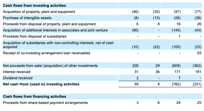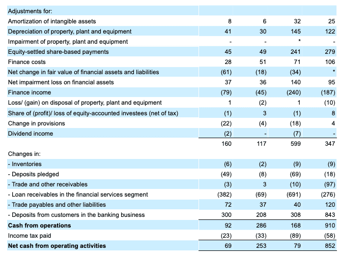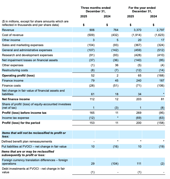 - Profit for the year was $200 million, a $358 million improvement YoY, driven by improvements in Adjusted EBITDA, increases in net finance income and lower share-based compensation expenses. Non-cash expenses included $241 million in share-based compensation expenses, $177 million of depreciation and amortization and $2 million profit from equity-accounted investees (net of tax).