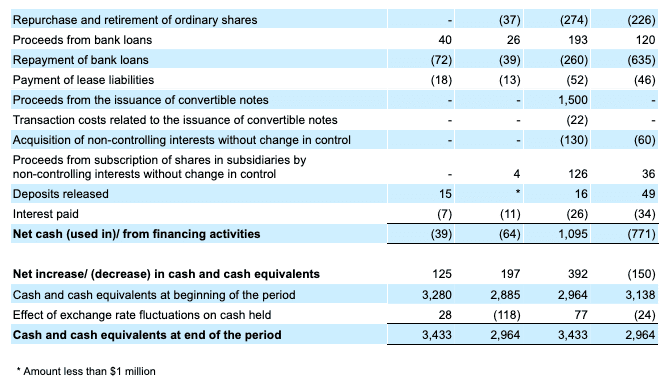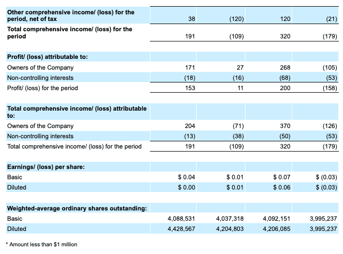 - Profit for the period was $153 million, an improvement of $142 million YoY, due to increased operating profit and net finance income, partially offset by higher income tax expenses incurred for the period.