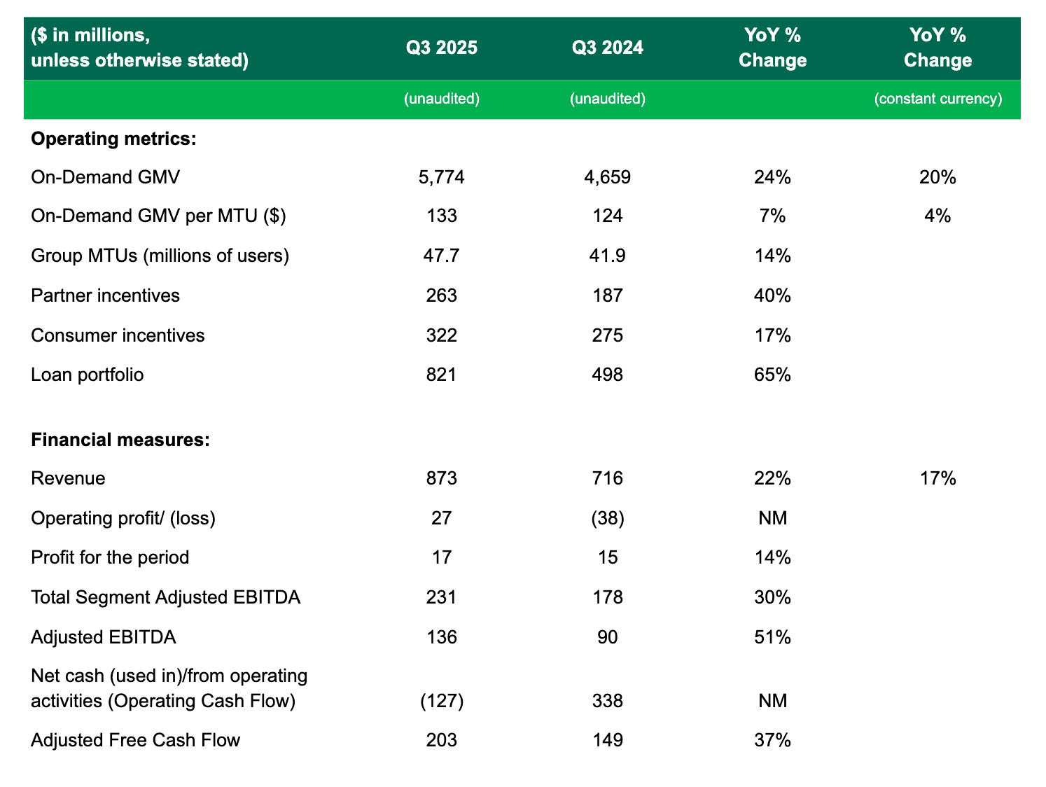 - Mobility revenue grew 17% YoY, or 13% YoY on a constant currency basis, in the third quarter of 2025. Growth was underpinned by strong growth in Mobility MTUs and total number of Mobility transactions. The growth in the number of Mobility transactions continued to outpace GMV growth at 30% YoY.