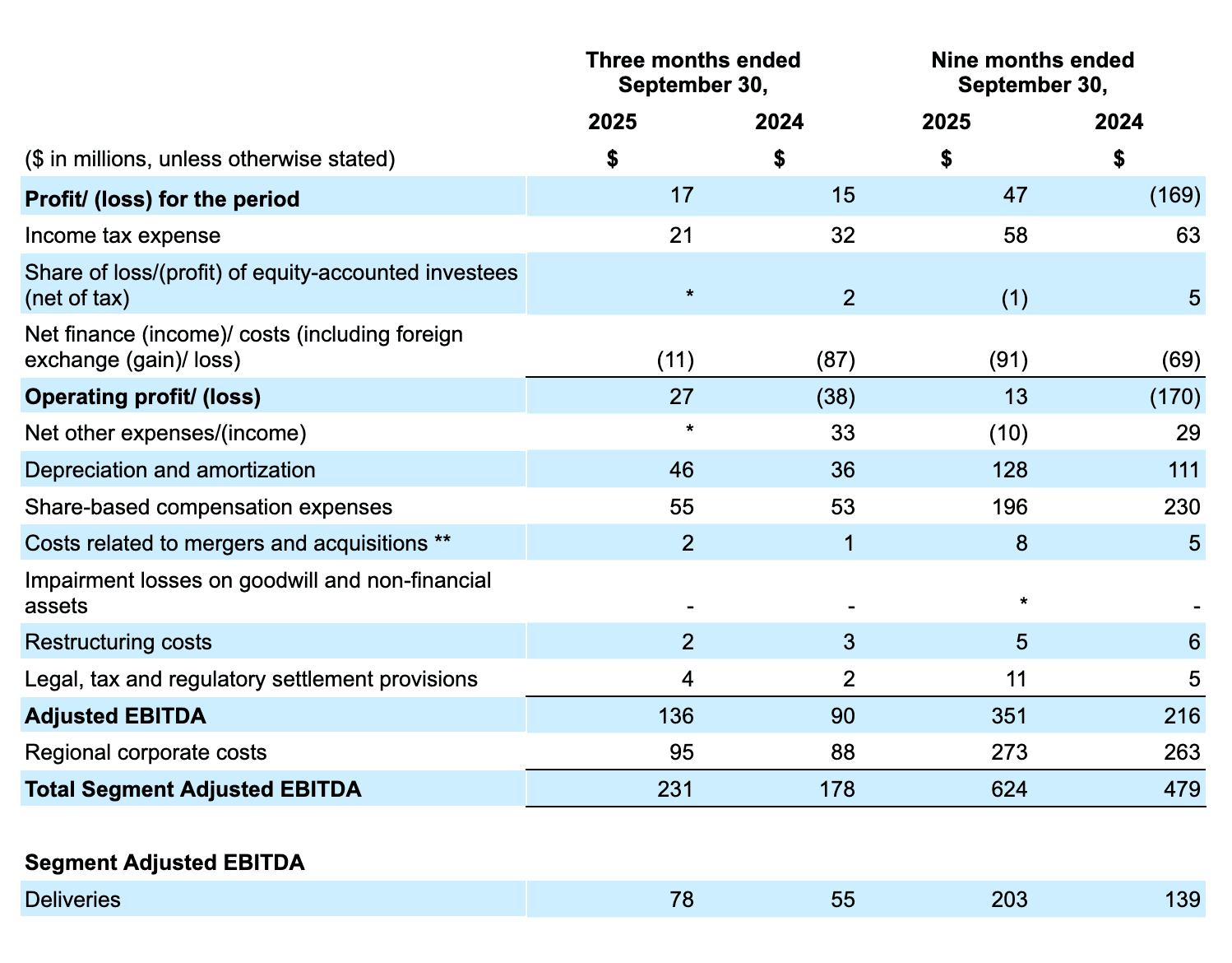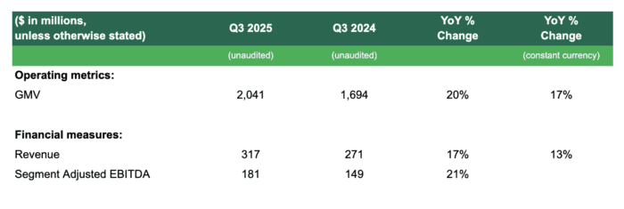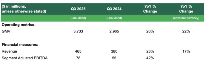 - Deliveries revenue grew strongly by 23% YoY, or 17% YoY on a constant currency basis, to $465 million in the third quarter of 2025. The strong growth was primarily driven by growth in Deliveries GMV and Advertising business revenue.