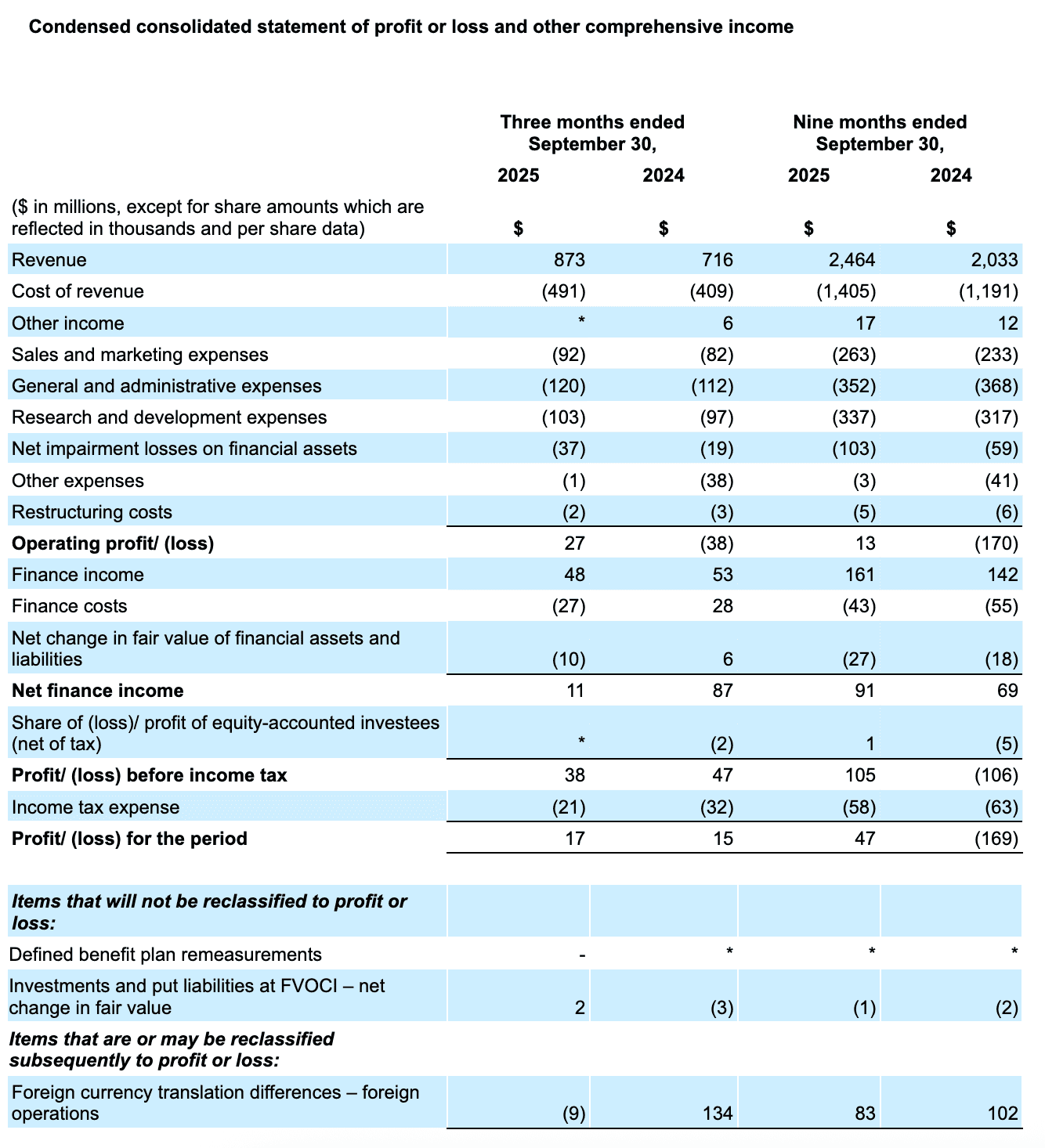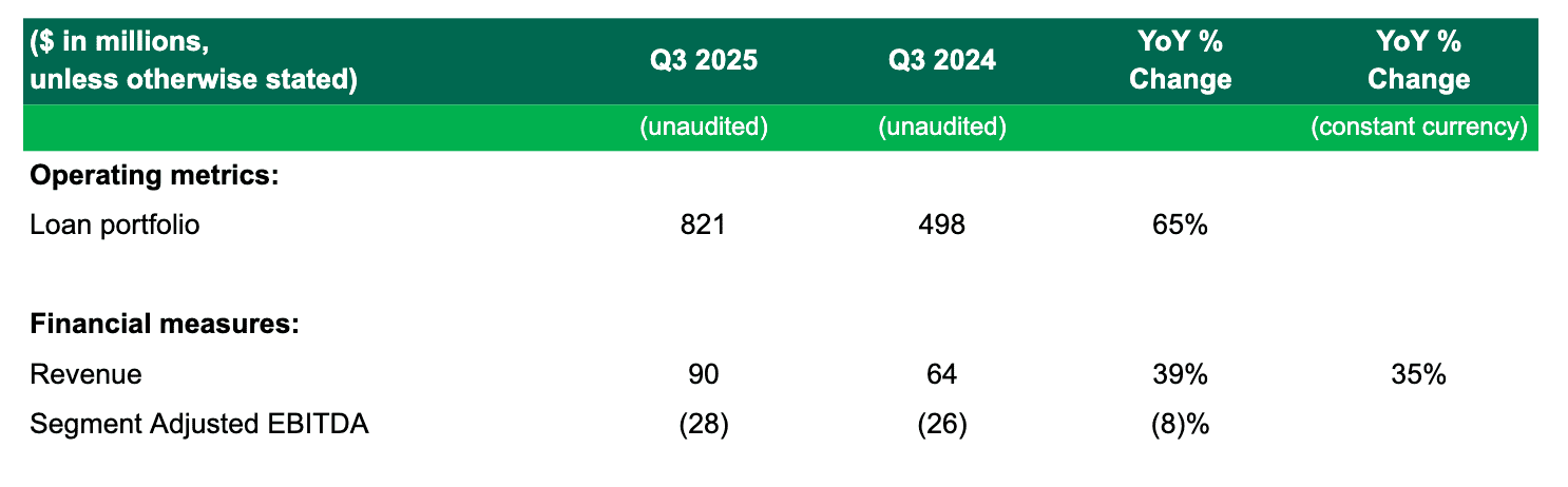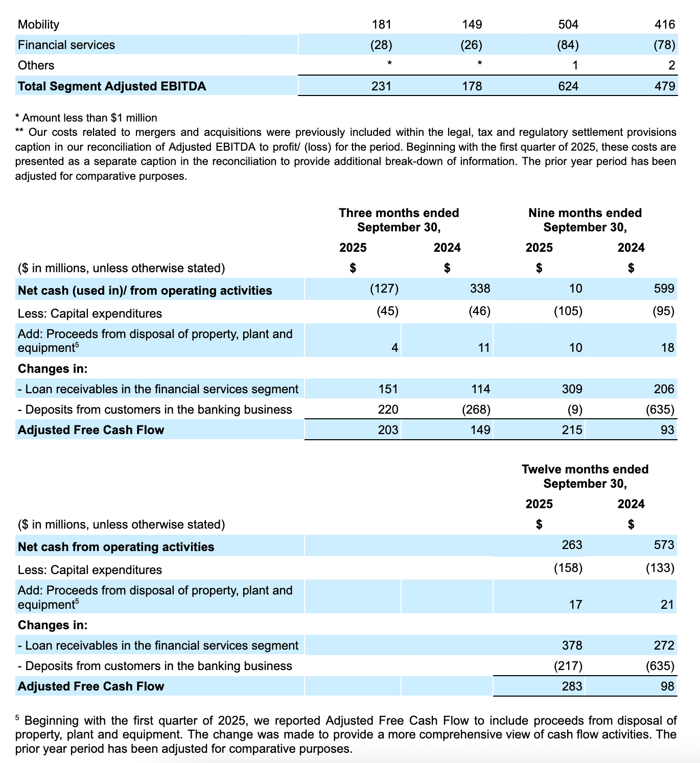 - Net cash used in operating activities was $127 million in the third quarter of 2025, an increased outflow of $464 million YoY, with higher cash outflows from deposits from customers in the banking business and higher cash outflows related to our lending businesses, which were partially offset by better operating performance. Adjusted Free Cash Flow was $203 million during the quarter, improving by $54 million YoY, and $283 million on a trailing 12-month basis, improving by $185 million YoY. Improvements in Adjusted Free Cash Flow were driven by increasing profitability and stronger focus on working capital management.