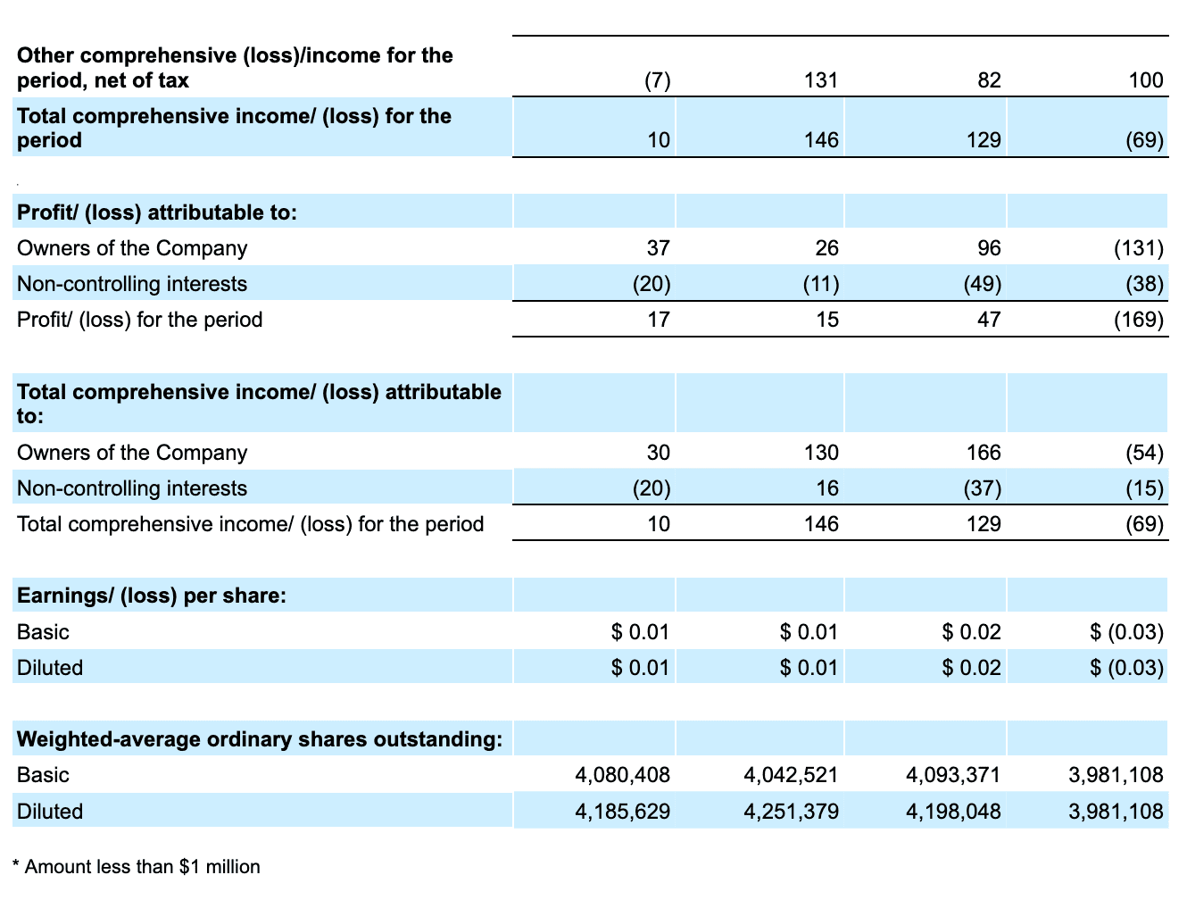 - Adjusted EBITDA is calculated as profit (loss) for the period adjusted to exclude: (i) net finance income (costs), including interest income (expenses), foreign exchange gain (loss) and changes in fair value of financial assets and liabilities, (ii) net other income (expenses), (iii) income tax expenses (credit), (iv) depreciation and amortization, (v) share-based compensation expenses, (vi) costs related to mergers and acquisitions, (vii) impairment losses on goodwill and non-financial assets, (viii) restructuring costs, (ix) legal, tax and regulatory settlement provisions, and (x) other items not indicative of our ongoing operating performance.