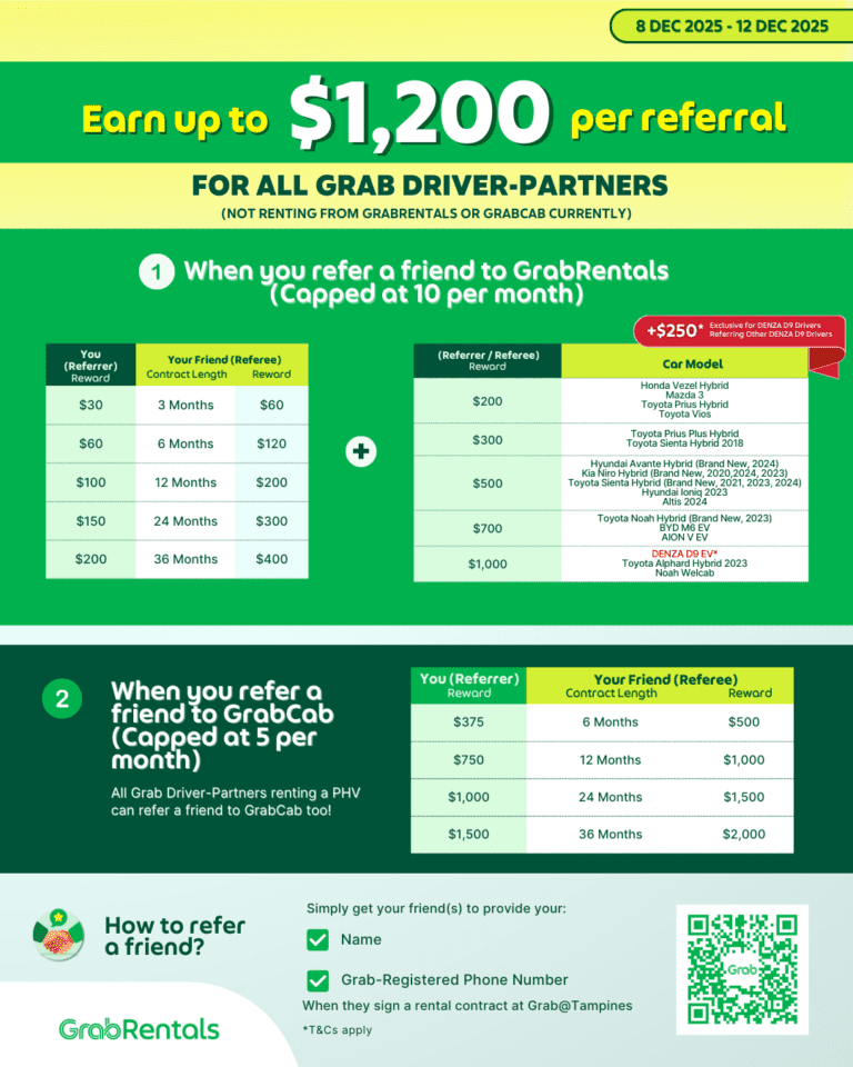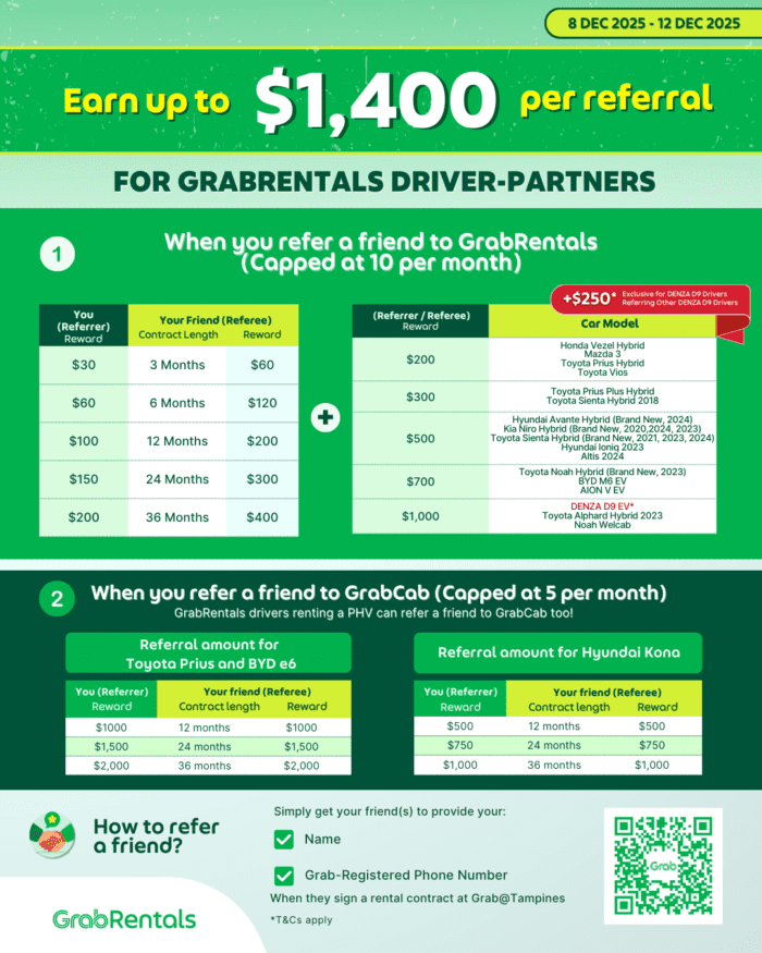 *Referral rewards will be credited into your Grab Driver Wallet in the month following the collection of either your friend’s car or yours, whichever occurs later.