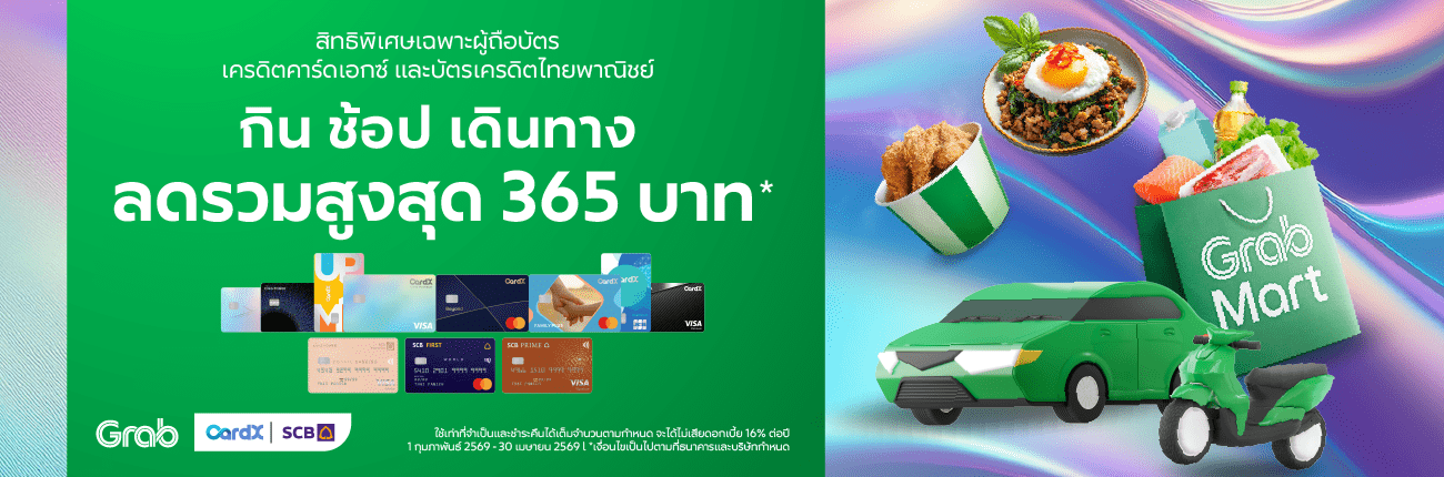 - ผู้ใช้บริการต้องใส่รหัสส่วนลด CARDXFOOD และเลือกจ่ายผ่าน GrabPay ด้วยบัตรเครดิตคาร์ดเอกซ์ และบัตรเครดิตไทยพาณิชย์ ก่อนสั่งซื้อเท่านั้น
