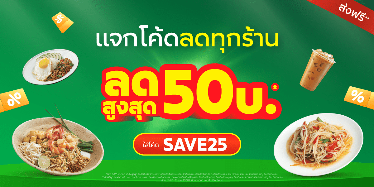 • **โค้ด ‘SAVE25’ ลด 25% สูงสุด 50 บ. ขั้นต่ำ 99 บ. สามารถใช้ได้ในจังหวัดต่อไปนี้เท่านั้น