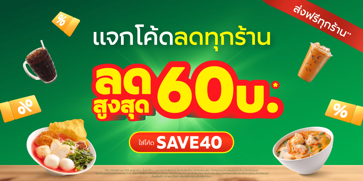 • **โค้ด ‘SAVE40’ ลด 40% สูงสุด 60 บ. ขั้นต่ำ 99 บ. สามารถใช้ได้ในจังหวัดต่อไปนี้เท่านั้น
