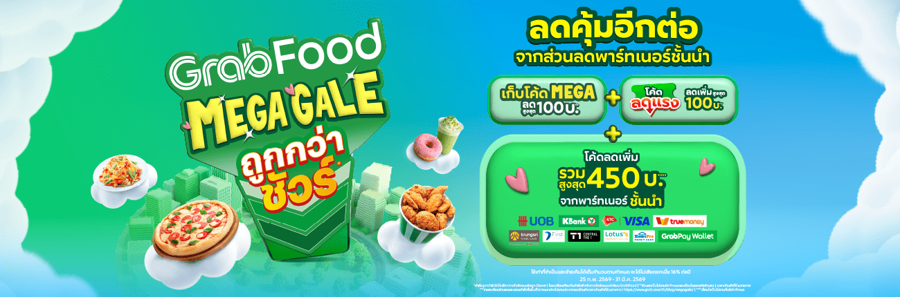 *ค่าส่งถูกกว่าชัวร์เมื่อเลือกการจัดส่งแบบส่งถูก (Saver) โดยเปรียบเทียบกับค่าส่งสำหรับการจัดส่งแบบปกติบน GrabFood | **ส่วนลดเป็นไปตามข้อกำหนดและเงื่อนไขของรหัสส่วนลด | เฉพาะร้านค้าที่ร่วมรายการ I ***รายละเอียดส่วนลดและยอดคำสั่งซื้อขั้นต่ำอาจแตกต่างไปตามประเภทของร้านค้า I เฉพาะร้านค้าที่ร่วมรายการ I https://www.grab.com/th/blog/megagale/ | ****เงื่อนไขเป็นไปตามที่บริษัทกำหนด