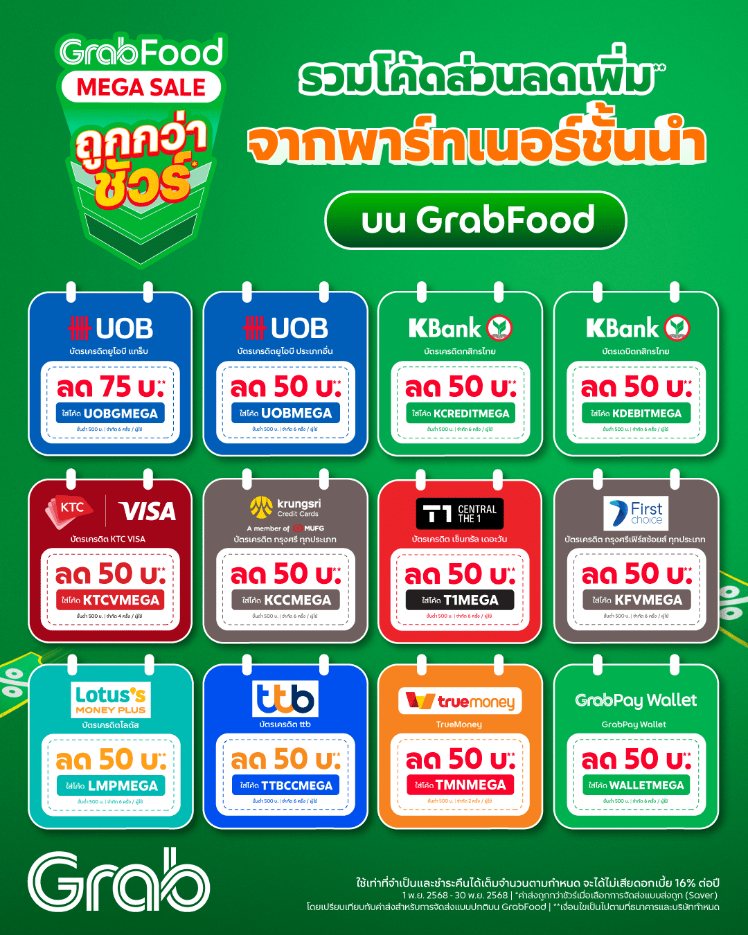 - ผู้ใช้บริการต้องใส่รหัสส่วนลด UOBGMEGA และเลือกจ่ายผ่าน GrabPay ด้วยบัตรเครดิตยูโอบี แกร็บ หรือบัตรเครดิตที่มีสัญลักษณ์ Grab บนหน้าบัตร ก่อนสั่งซื้อเท่านั้น