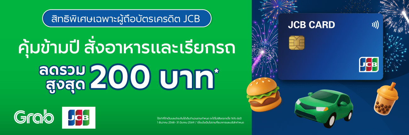 - ผู้ใช้บริการต้องใส่รหัสส่วนลด JCBFOOD20 และเลือกจ่ายผ่าน GrabPay ด้วยบัตรเครดิต JCB ที่ออกโดยสถาบันการเงินในประเทศไทยก่อนสั่งซื้อเท่านั้น