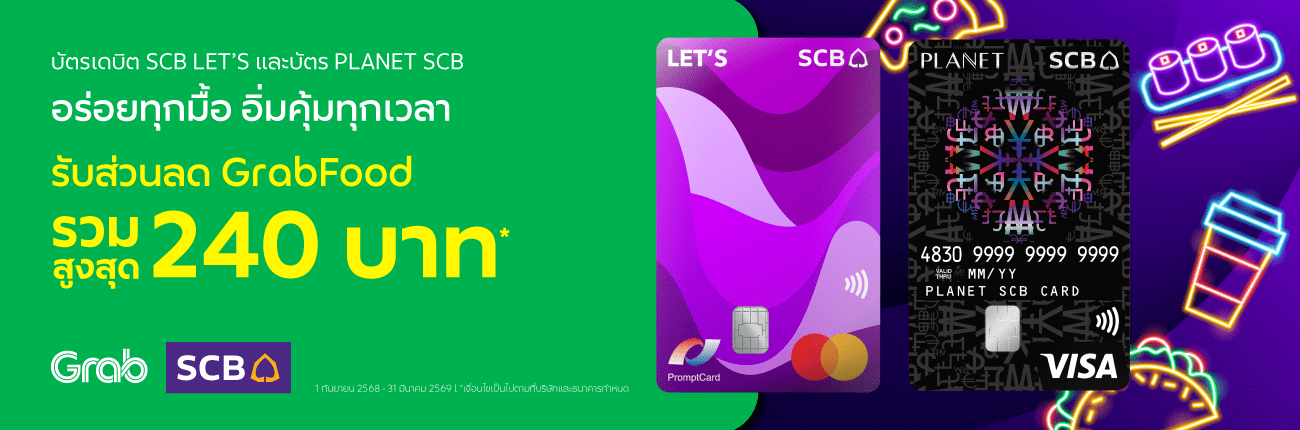 - ผู้ใช้บริการต้องใส่รหัสส่วนลด SCBPNFOOD และเลือกจ่ายผ่าน GrabPay ด้วยบัตร SCB Planet ของธนาคารไทยพาณิชย์ จำกัด (มหาชน) ก่อนสั่งซื้อเท่านั้น